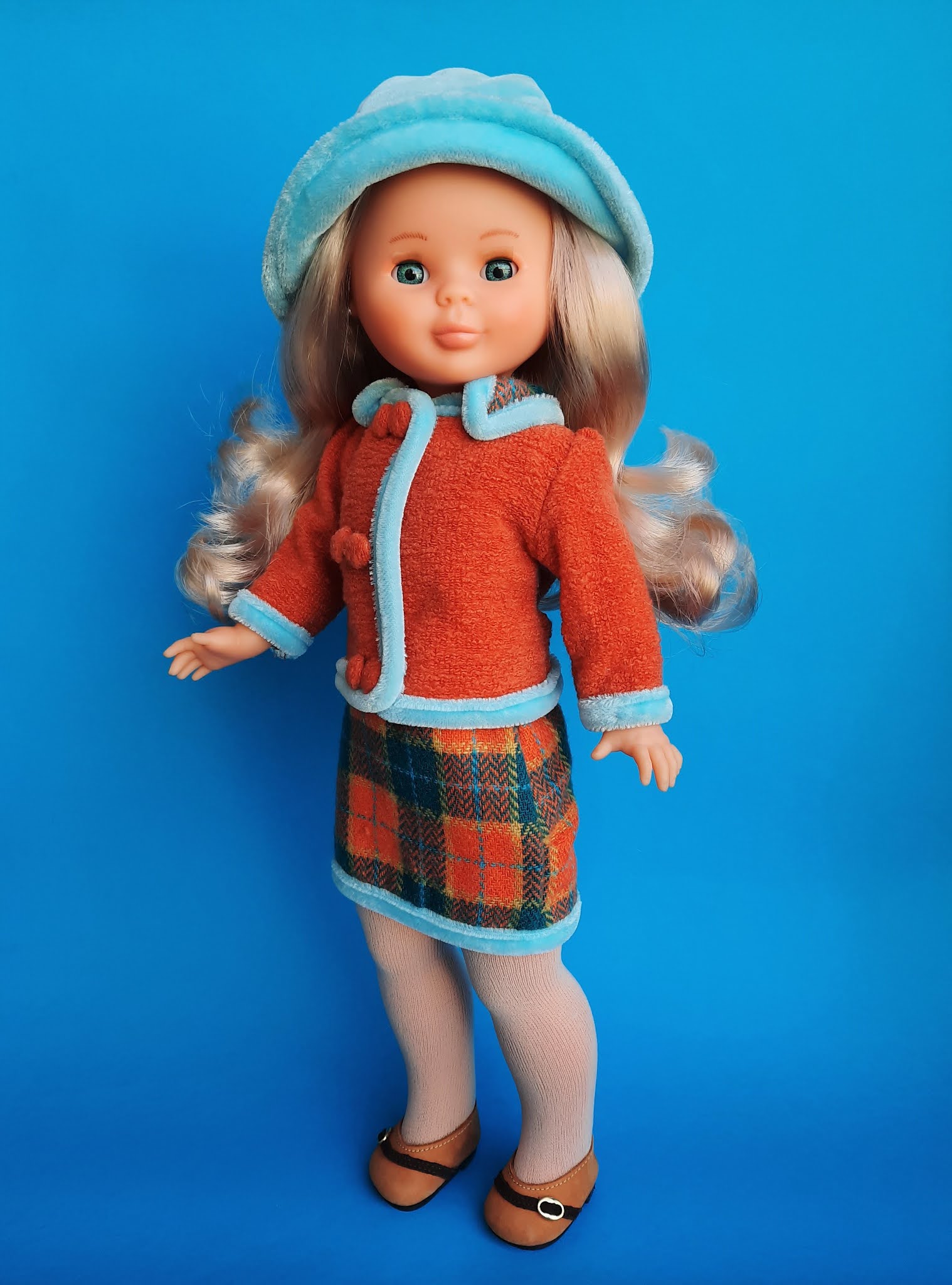 Pobre, después de tres años sin salir del sarcófago y la envías tan pronto de vuelta!!! Lo que más me gusta es la faldita en tartán tan cálido y los rulitos que le has puesto. El resto, no es de mis favoritas, porque la tela de la chaqueta me parece que no le pega. Y el gorro playero o marinero, pues tampoco me parece que le pegue al conjunto. Tendría que haber sido un casquete tipo Jackie?? Bueno, no problem. Solo es una pequeña opinión en un océano de gustos!!!